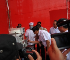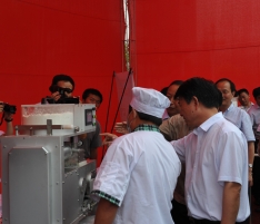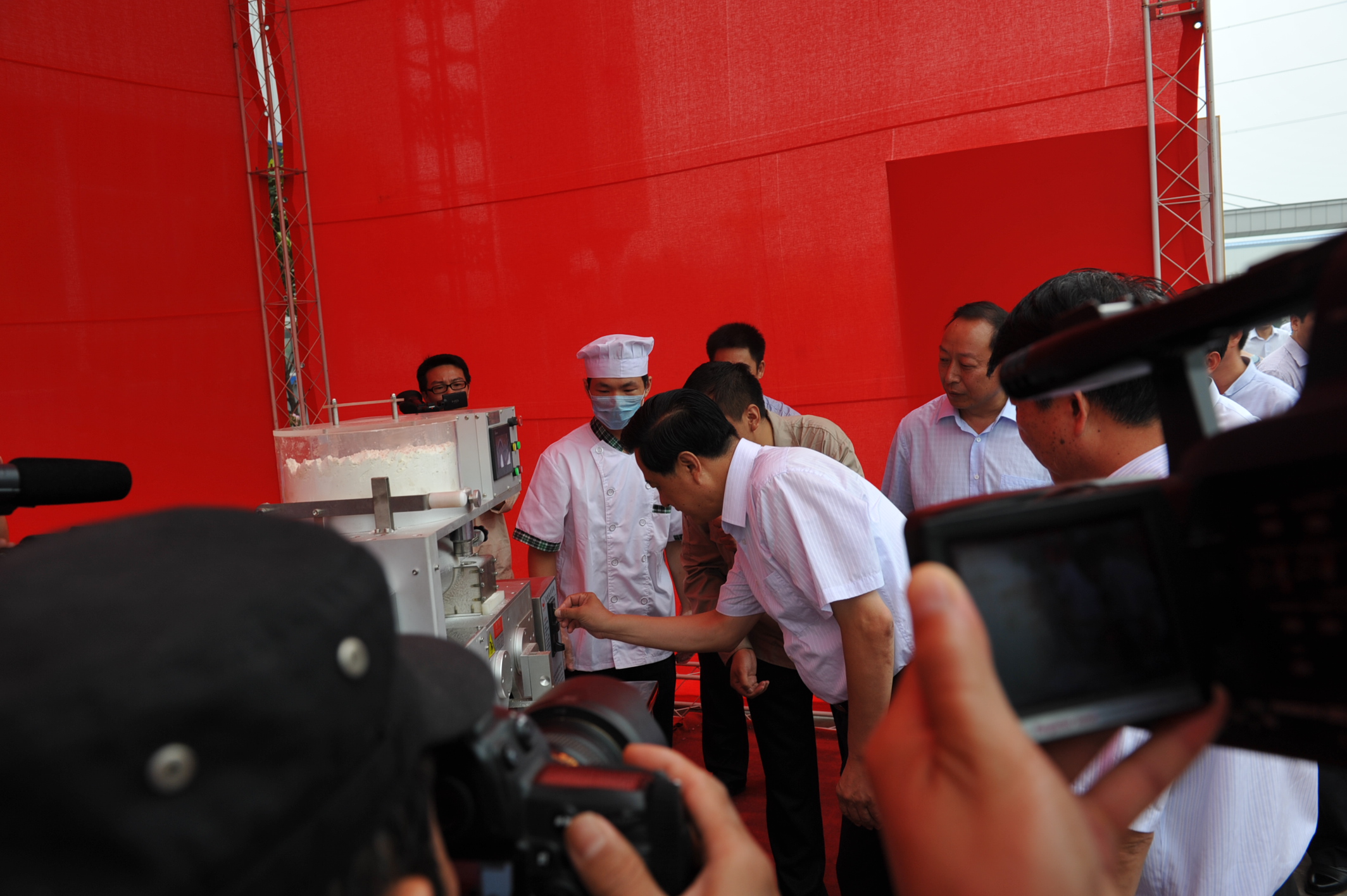 惠民工程與產(chǎn)品創(chuàng)新成觀摩新亮點,市委書記王樹山鼓勵董事長王曉杰放眼于未來,著眼于當下,務必把各項工作做精、做細、做扎實! 本報訊(仝利坡) 7月21日,市委書記王樹山、市長張國暉攜百人觀摩團到我司觀摩,襄城縣縣委書記蘇建濤、縣長何天立陪同觀摩。 襄城縣發(fā)改委辦公室主任向觀摩團一行報告我司發(fā)展歷程、產(chǎn)品結(jié)構(gòu)、建設項目、市場前景、社會效益和利稅狀況。 公司董事長王曉杰向市委、市政府觀摩團著重介紹公司戰(zhàn)略產(chǎn)品。在全自動制面機展示區(qū),董事長王曉杰向觀摩團介紹:全自動制面機以快速成型,從和面、壓片、成型一次完成僅需10秒鐘之內(nèi)即可做出口感不輸傳統(tǒng)工藝的面條,制面效率提升百倍以上;根據(jù)食量不同,設置單份面條分量和連續(xù)出面條的份數(shù),通過份數(shù)的設置可實現(xiàn)1-999份的任意數(shù)值的連續(xù)作業(yè);可任意通過更換面刀而實現(xiàn)白面、雜面、蔬菜面、蘭州拉面、烏冬面、刀削面等多種面條的制作。未來計劃進入商超、部隊、社區(qū)、學校,為人民群眾提供快捷、健康的主食供應服務。 具有科研背景的市委書記王樹山聽完董事長王曉杰的解說后對全自動制面制興趣濃厚,隨手拿到一元硬幣,親自通過投幣體驗全自動制面機的操作,市長張國暉也在工作人員的介紹下操作PLC控制系統(tǒng)體驗全自動鮮食面加工過程。 董事長王曉杰在包子機展示區(qū)介紹說:包子機在2011年12月通過省級科技成果鑒定,2012年5月獲得許昌市科技進步一等獎。包子機采用