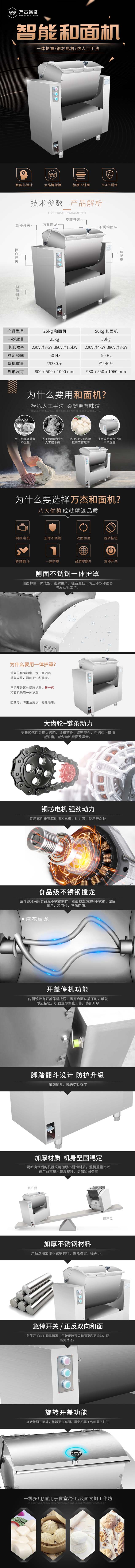 ■ 主要技術(shù)參數(shù): 一次和面量:25KG 產(chǎn)品型號:WJ-HMJ50A 一次和面量:50KG 額定電壓:380V 功 率:3.0KW 外形尺寸:980×550×1060MM 機(jī)器重量:220KG ■ 性能特點(diǎn): 1. 采用腳踏翻斗,降低勞動強(qiáng)度 2. 具有掀蓋停機(jī)功能,集成線路板起過載、短路、缺相、過壓、欠壓保護(hù)作用,穩(wěn)定系數(shù)高 3. 采用銅線電機(jī),配備好的減速機(jī),穩(wěn)定耐用噪音低 4. 面斗部分采用好的不銹鋼制作,和面攪龍為304不銹鋼,堅(jiān)固耐用,美觀大方 ■ 產(chǎn)品介紹: